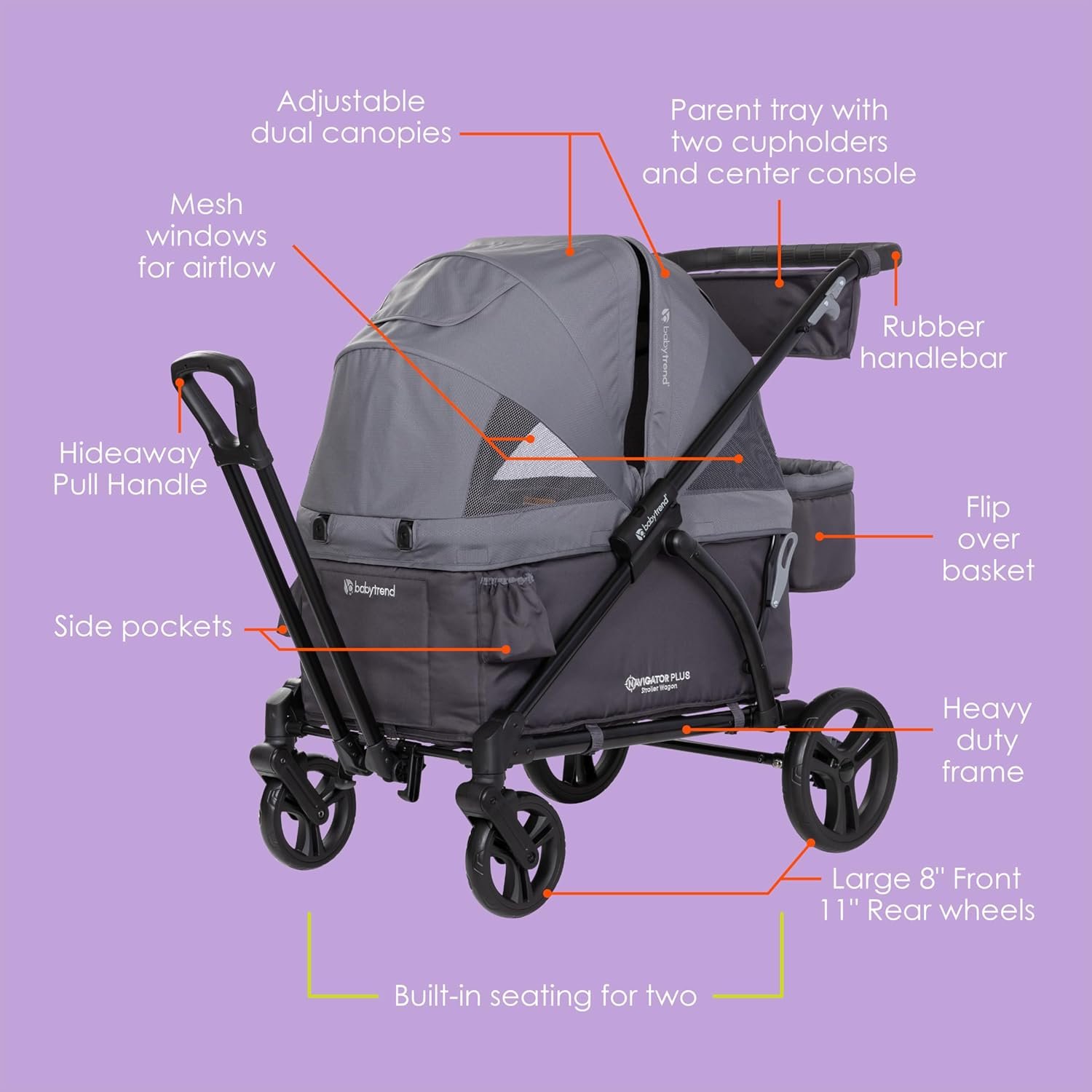 The Baby Trend Navigator PLUS 2-in-1 Stroller Wagon provides a convenient and flexible way for parents to transport their children while carrying essential items during outings. Designed with both stroller and wagon functionality, it allows families to switch between strolling mode using the push handle and wagon mode using the hideaway pull handle for different travel situations.