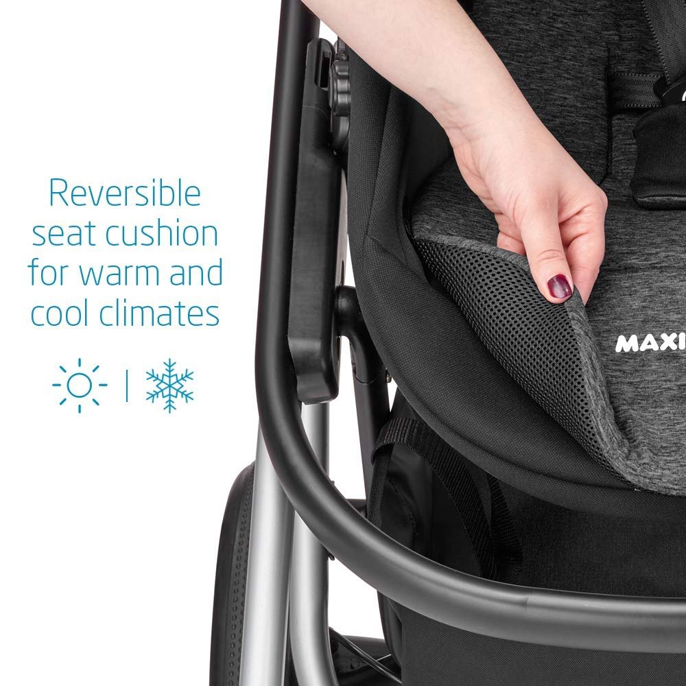 The stroller seat features a reversible seat cushion, allowing parents to adjust between warm and cool fabric surfaces depending on the climate. The cushion is also machine washable, making cleanup simple after everyday use.