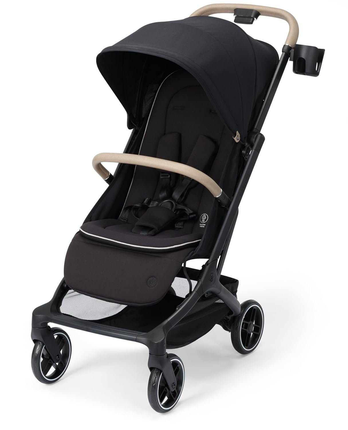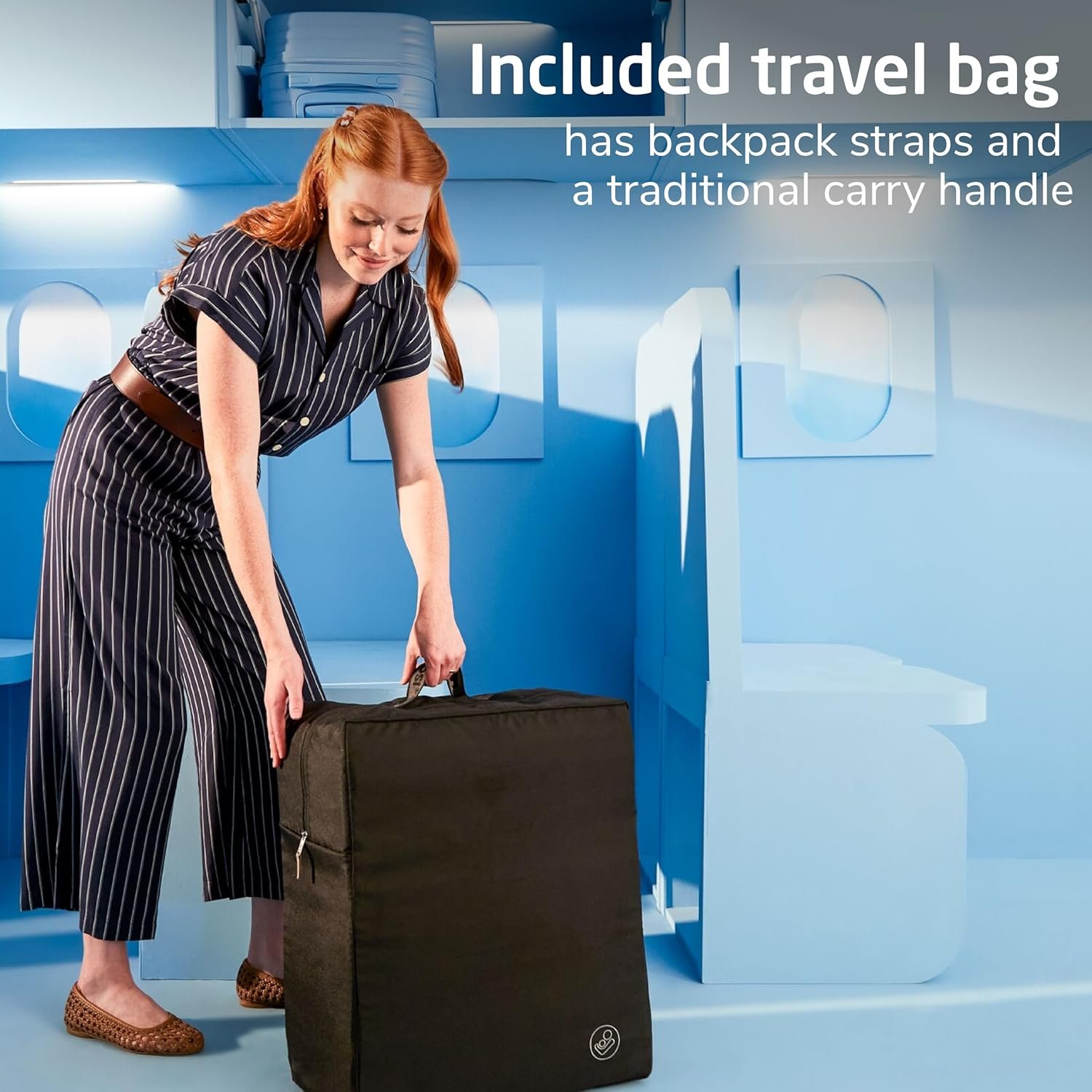 Its fold aligns with the carry-on size guidelines recommended by the International Air Transport Association (IATA), allowing it to fit in most airplane and train overhead compartments. The one-hand fold mechanism makes transitions quicker when managing luggage or holding your child. Once folded, it stands on its own for easier storage.