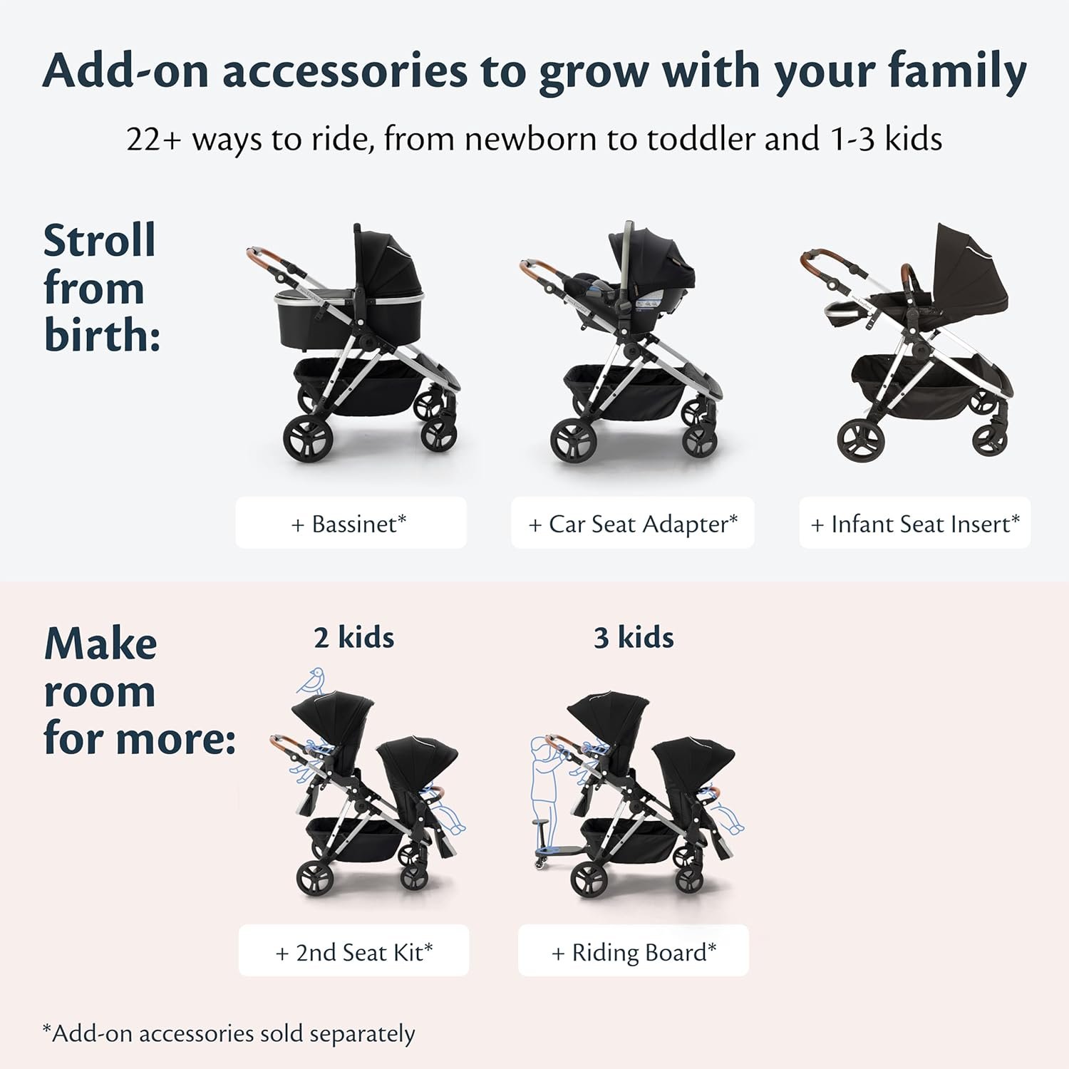 Use it from day one and expand later with add-ons like a Bassinet, Infant Insert, 2nd Seat Kit, or Riding Board (sold separately). -